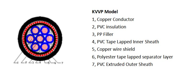 2.1 Varinis laidininkas, PVC izoliacija, PVC apvalkalas, varine viela pintas ekranuotas valdymo kabelis 2.2 Varinis laidininkas, PVC izoliacija, PVC apvalkalas, varine juostele padengtas ekranuotas valdymo kabelis 2.3 Lankstus vario laidininkas, PVC izoliacija, PVC apvalkalas, varine viela pintas ekranuotas valdymo kabelis 2.4 Vario juosta ekranuotas valdymo kabelis su plienine juostele, skirta sustiprinti mechaninę apsaugą 2.5 Varinis laidininkas, XLPE izoliacija, varine viela pintas ekranuotas valdymo kabelis (atsparus aukštai temperatūrai,